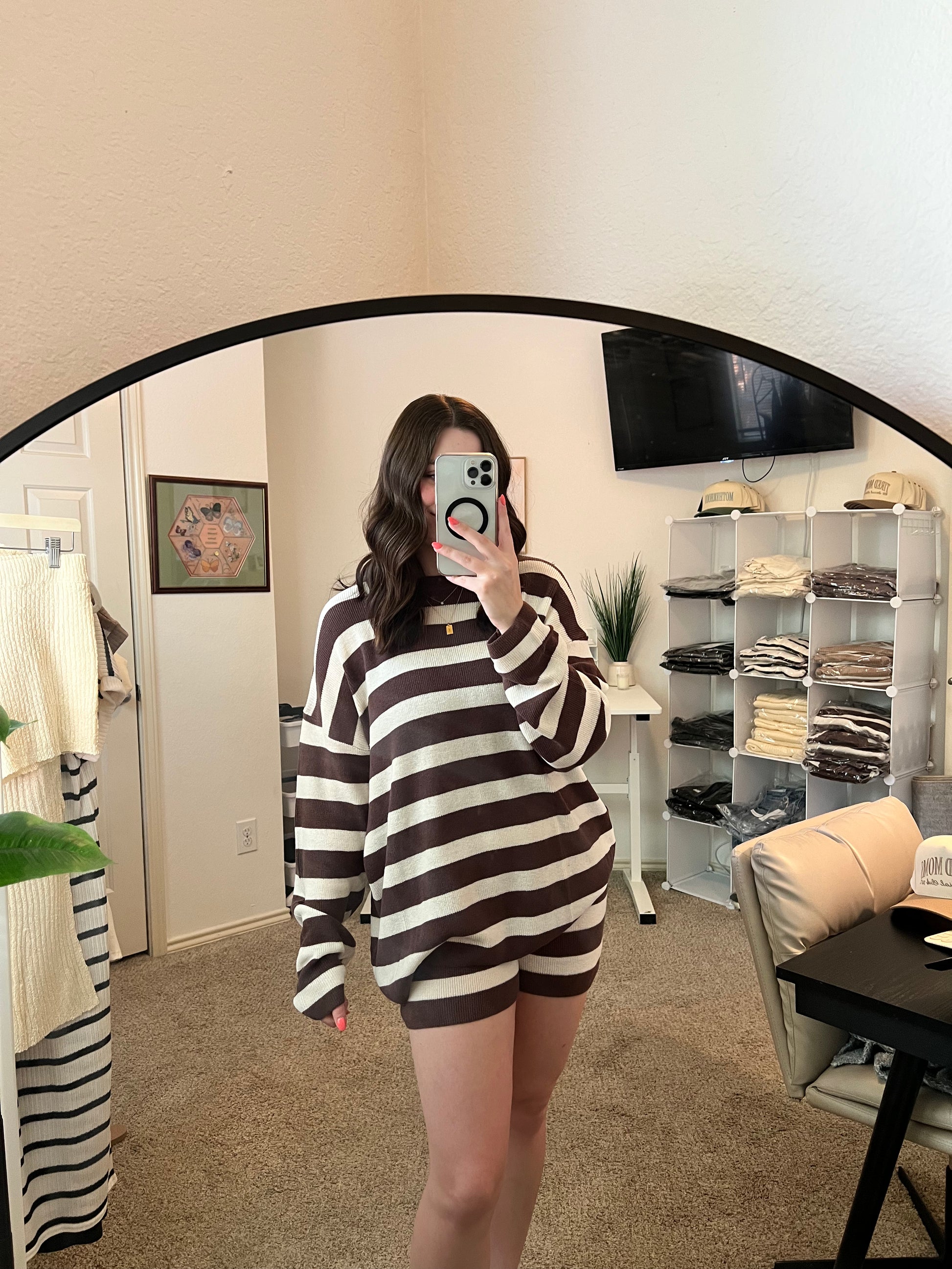 Stay cozy and stylish with this knitted wide stripe sweater and shorts set. The oversized sweater and comfy-fit shorts create a relaxed, cool vibe.
